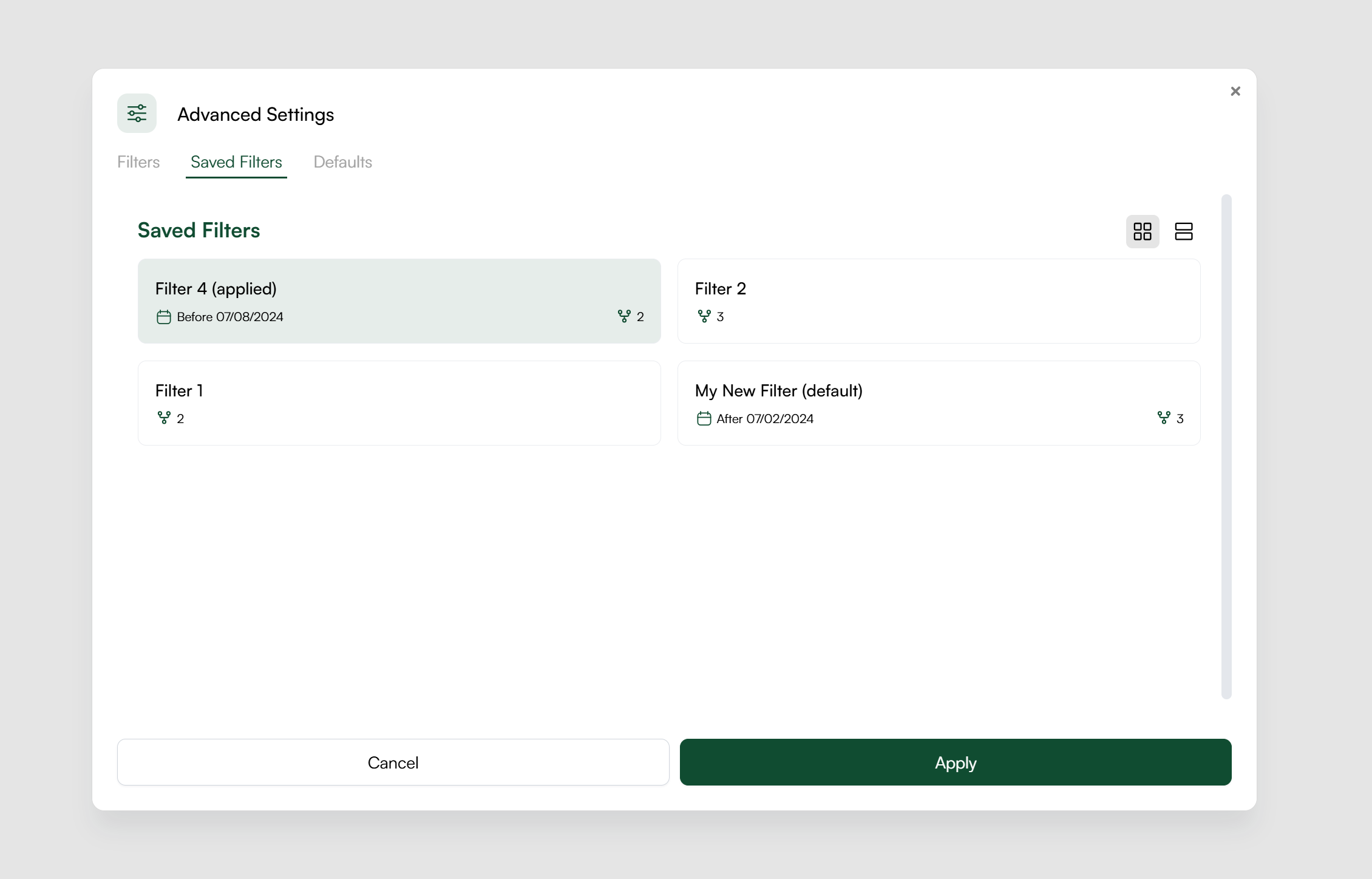 As mentioned, your saved settings can be applied as both your default values and to your current query. To load them as defaults select them from the Query Settings page. To load them for your current query, open the Advanced Settings dialogue, navigate to the Saved Filters tab, and select the desired filters.