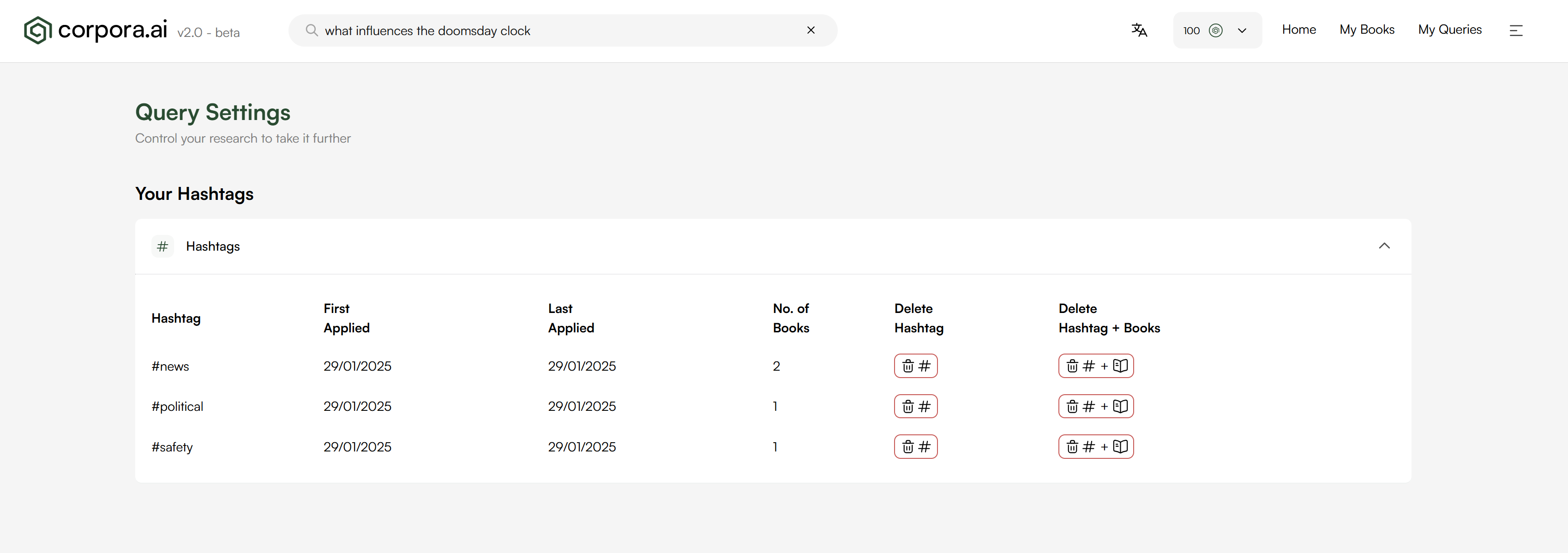 We have introduced a new page where a user can control and fine-tune their research interface. In this initial release of the page users can manage all of their hashtags and associated books. The screenshot below depicts the hashtag functionality of the page.