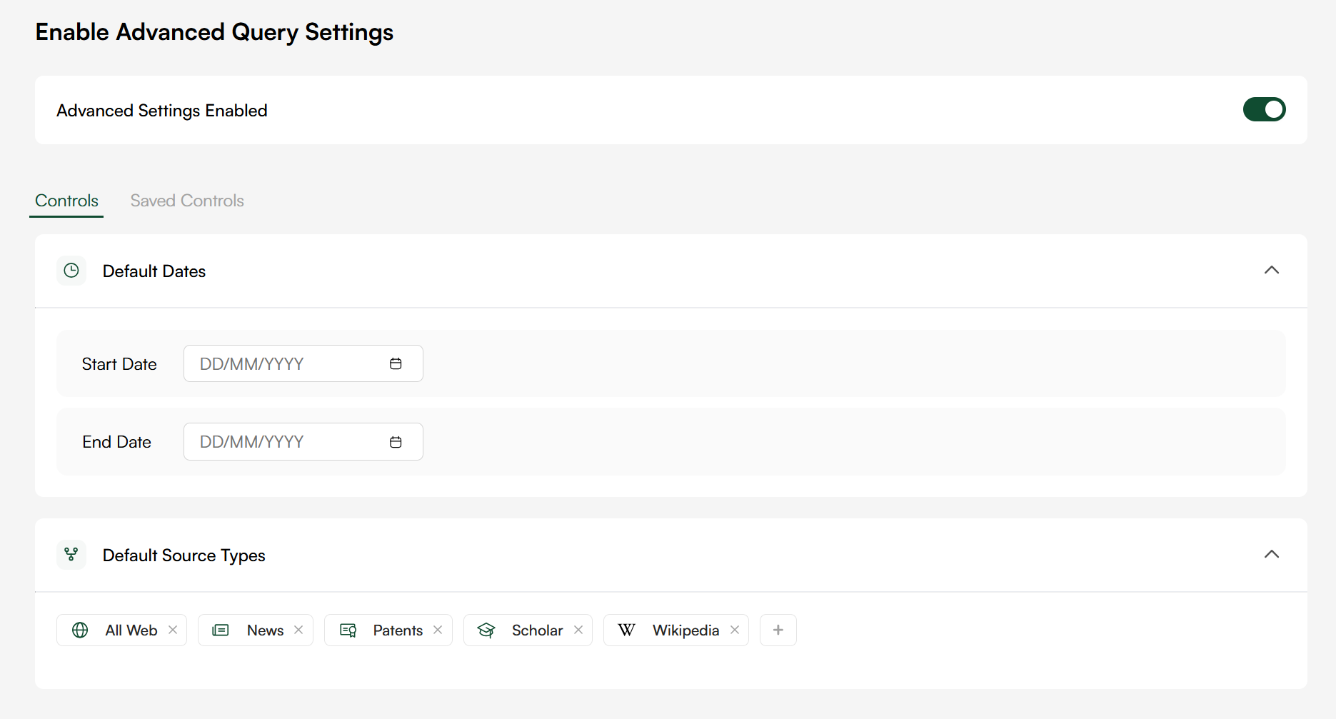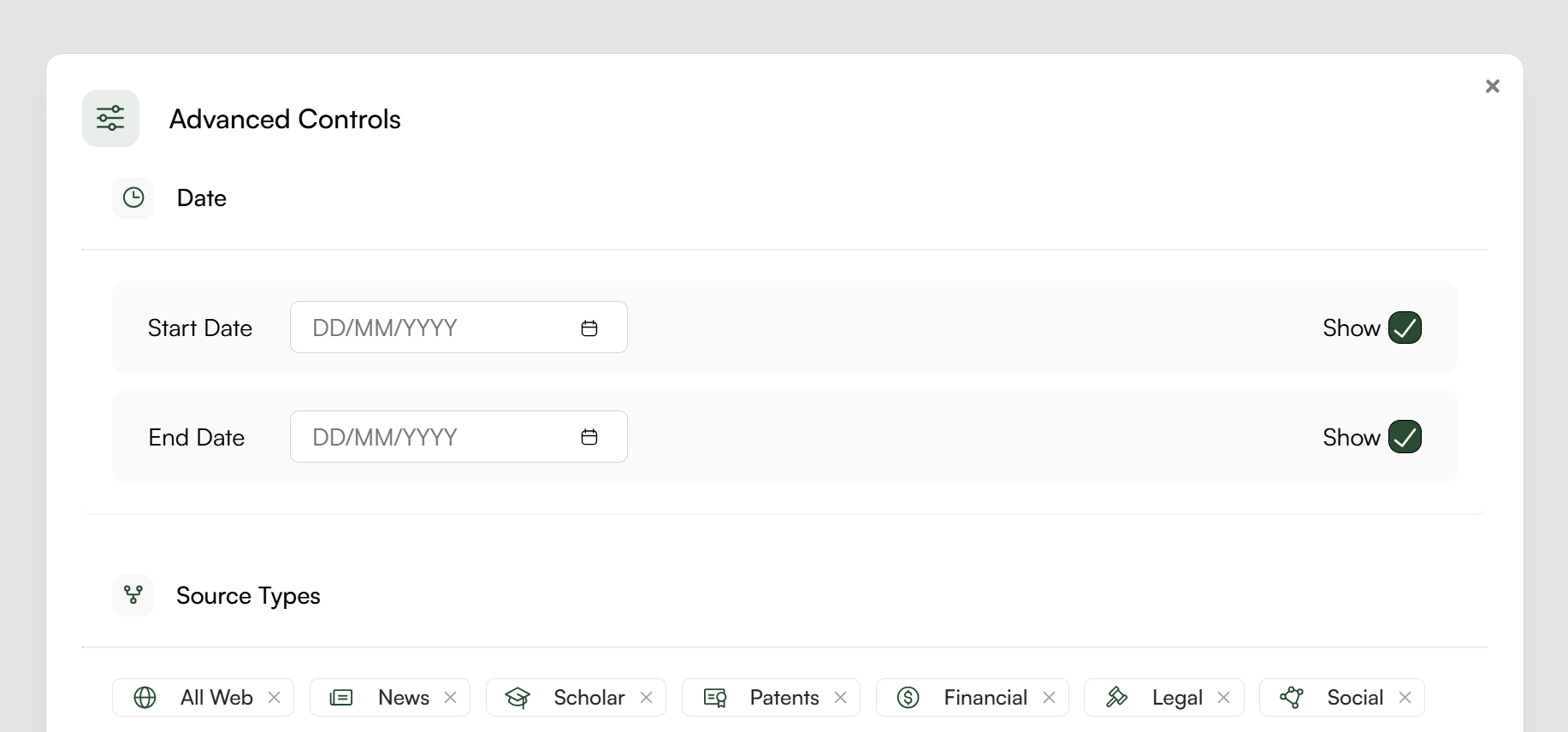 Future functionality will allow users to be able to control their research interface in the form of granular controls over sources and date ranges as well as being able to store and reuse these filters over multiple research journeys. Below is a sneak-peek of how we envisage this working.