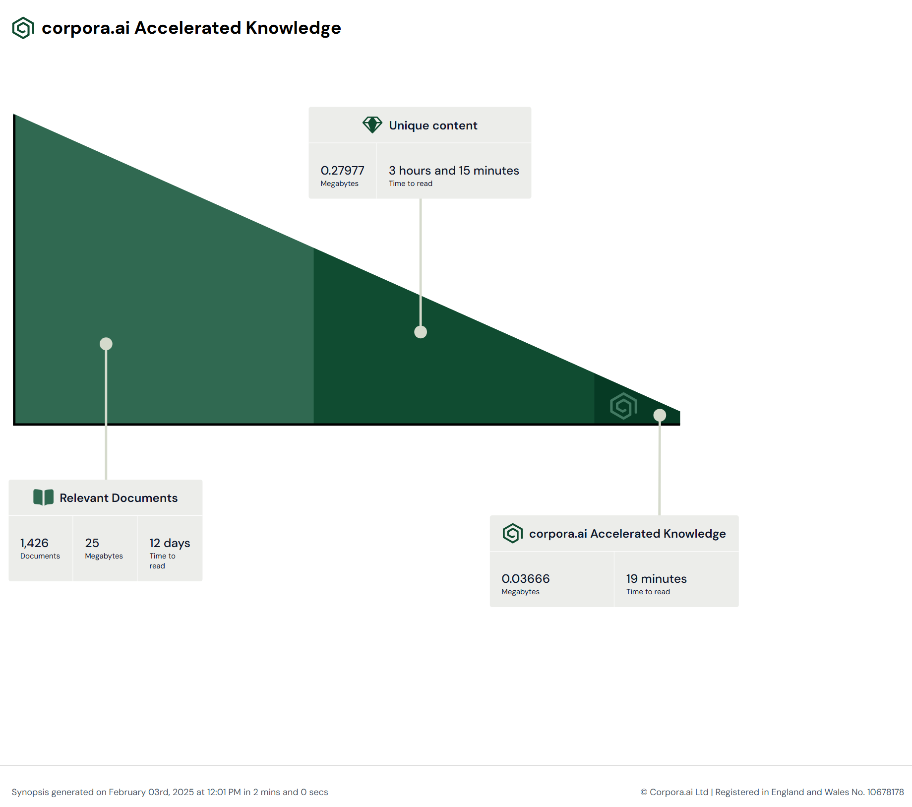 From hypothesis to fully attributed and generated research report, takes under 60 seconds. For the article above, the following infographic is shown at the bottom to depict the distillation of information, which highlights the value being extracted in such a short amount of time from our bespoke AI Research Engine.